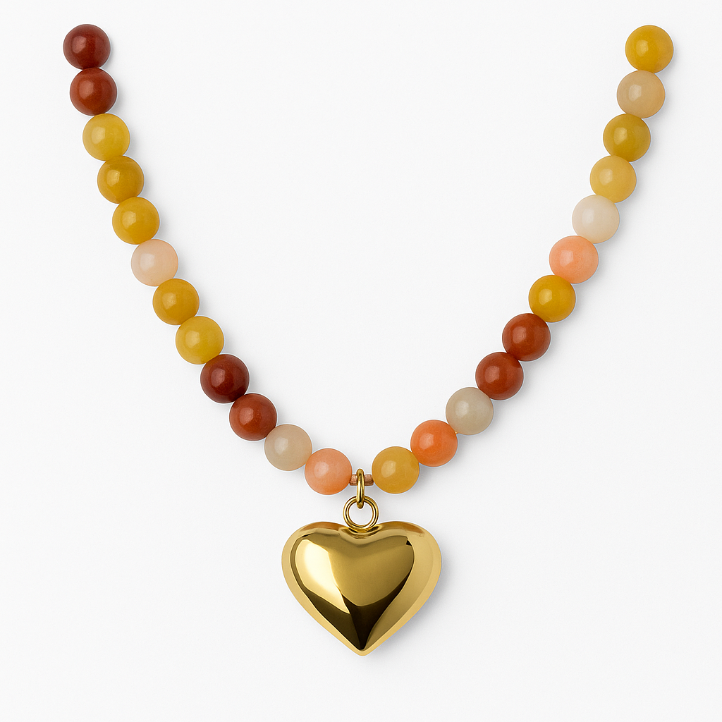 El Collar Latido de la Tierra es una pieza vibrante y cálida que conecta con la energía del corazón y la fuerza de la naturaleza.