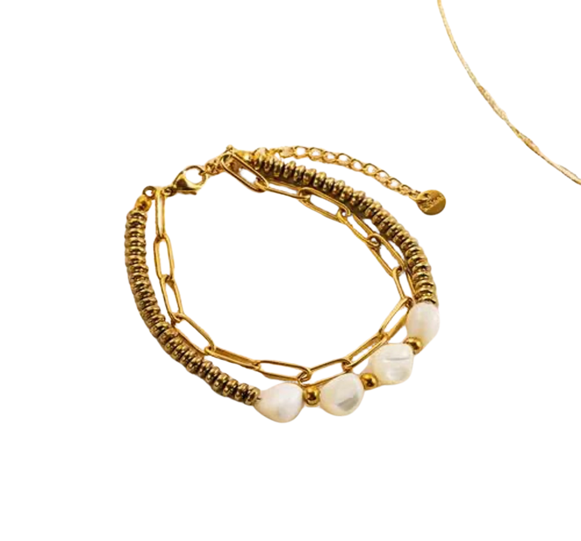 - Doble diseño: una cadena de eslabones grandes y otra de pequeñas cuentas doradas, que crean un contraste elegante y moderno.